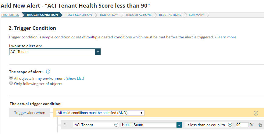 - In the actual trigger condition, ensure that ACI Tenant is selected in the first drop-down.