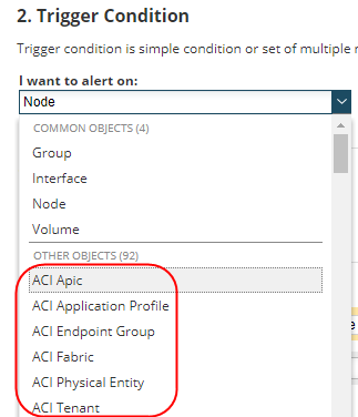 - On Trigger Condition, select the ACI entity you want to be alerted about. In this case, select ACI Tenant.