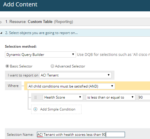 - In Select objects to report on, select ACI Tenant, and add a condition that says Heath Score is less or equal than 90.