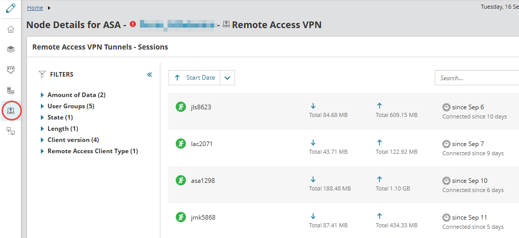 On the Remote access VPN subview, you can see a list of remote access tunnels, with the user name and tunnel duration details.