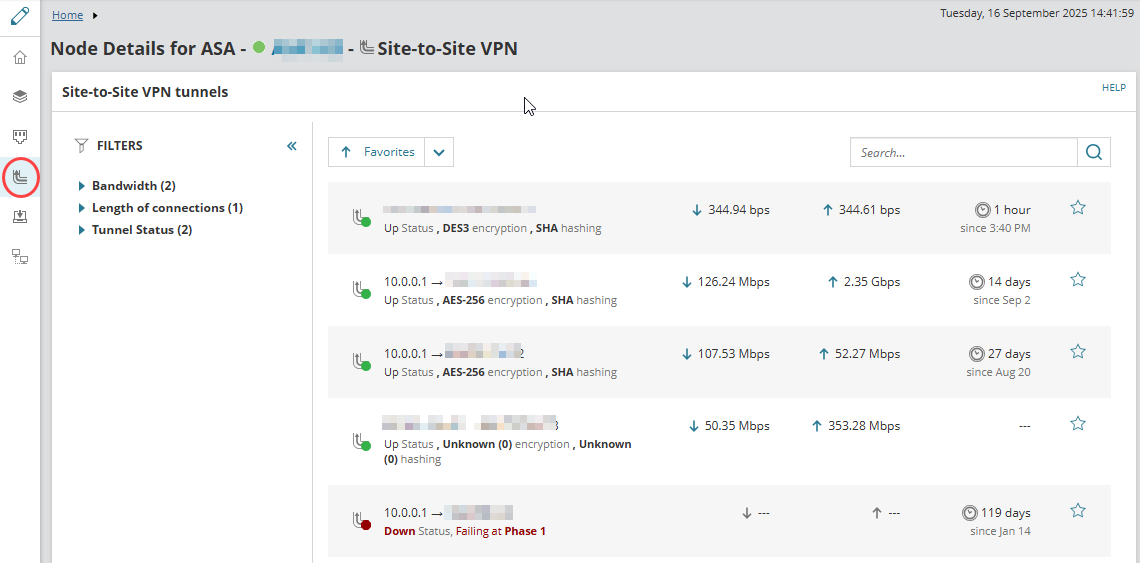 Click the star icon to add a Site-to-Site VPN tunnel to favorites that are featured on the Node Details for ASA - Summary view.