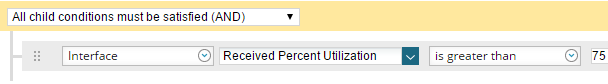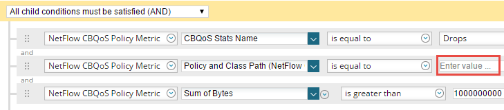 - To be alerted on all policies (Drops, Pre-Policy, or Post-Policy, based on the selection in the CBQoS Stats Name line) that exceed the specified sum of bytes, delete the Policy and Class Path line from the trigger condition.