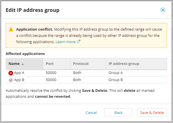 - If you have an Application with only one IP address group (source or destination, not both) in conflict, you can resolve the conflict by configuring the second IP address group, making this application more specific. This application will not be in collision anymore because more specific applications are preferred in processing.