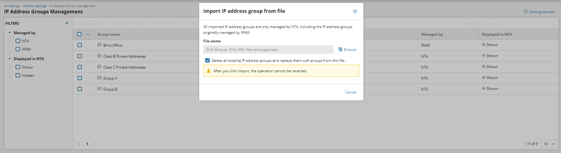 - Import IP address groups as IP address groups managed by NTA, deleting the existing groups.