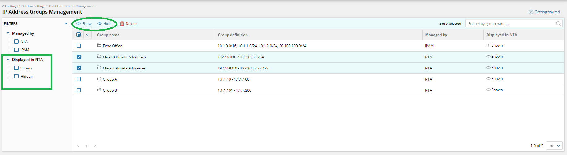 After selecting an IP address group, you can click Show for NTA to display IP address groups in widgets, or Hide in order to hide them. You can filter out the IP address groups that are either shown or hidden in the sidebar on the IP Address Groups Management page.
