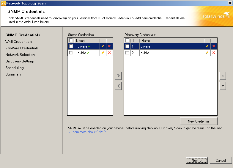 If you are not using the default public and private community strings, select public and click Remove Credential. Repeat this process for the private string.