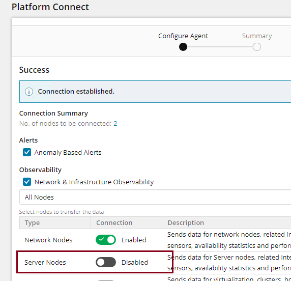 Ensure that you have enabled transferring data for both Network Nodes and Server Nodes for the Platform Connect. See Set up Platform Connect in the SolarWinds Platform documentation.