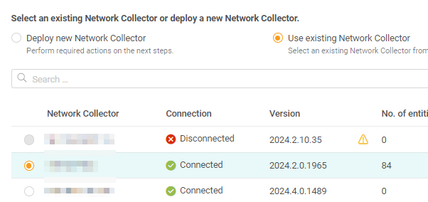 On Select Network Collector, select Use existing Network Collector and select the collector you want to poll the new network device by. You can only select a Network Collector version 2024.2.10 and later which is Connected. Earlier versions of the collector do not support adding devices and adding devices requires an active connection. If you don’t find a suitable collector, deploy a new one or upgrade an existing collector to 2024.2.10.