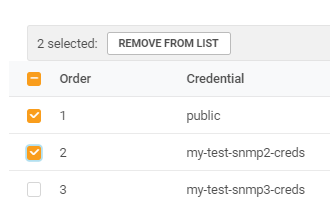 Reorder credentials: The order of polling methods is set by the preferred method selection. To reorder credentials within the polling method, go to the polling method tab (SNMP or WMI) and use the arrows in the Actions column.   Remove credentials from discovery: On the polling method tab (SNMP or WMI), select the credentials and click Remove from list. The credentials are removed from the discovery but are still available among existing credentials.