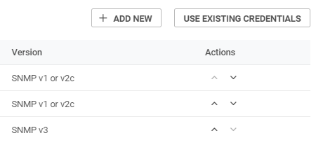 To use existing credentials, click Use Existing Credentials, select credentials for the discovery, and click Save. The selection order reflects the order in which the credentials will be used in the scan. To change the order, use arrows in the Actions columns.