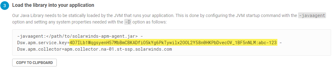 Load the library for monitoring. Use the code sample provided under Load the library into your application, but replace </path/to/solarwinds-apm-agent.jar>with the path to the .jar file downloaded earlier. For instructions for your specific web server, see Load the library.Restart the JVM to load the library.