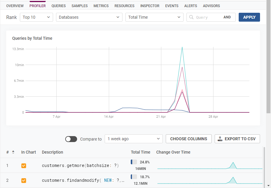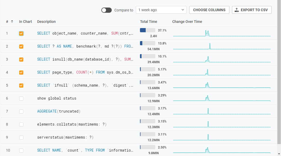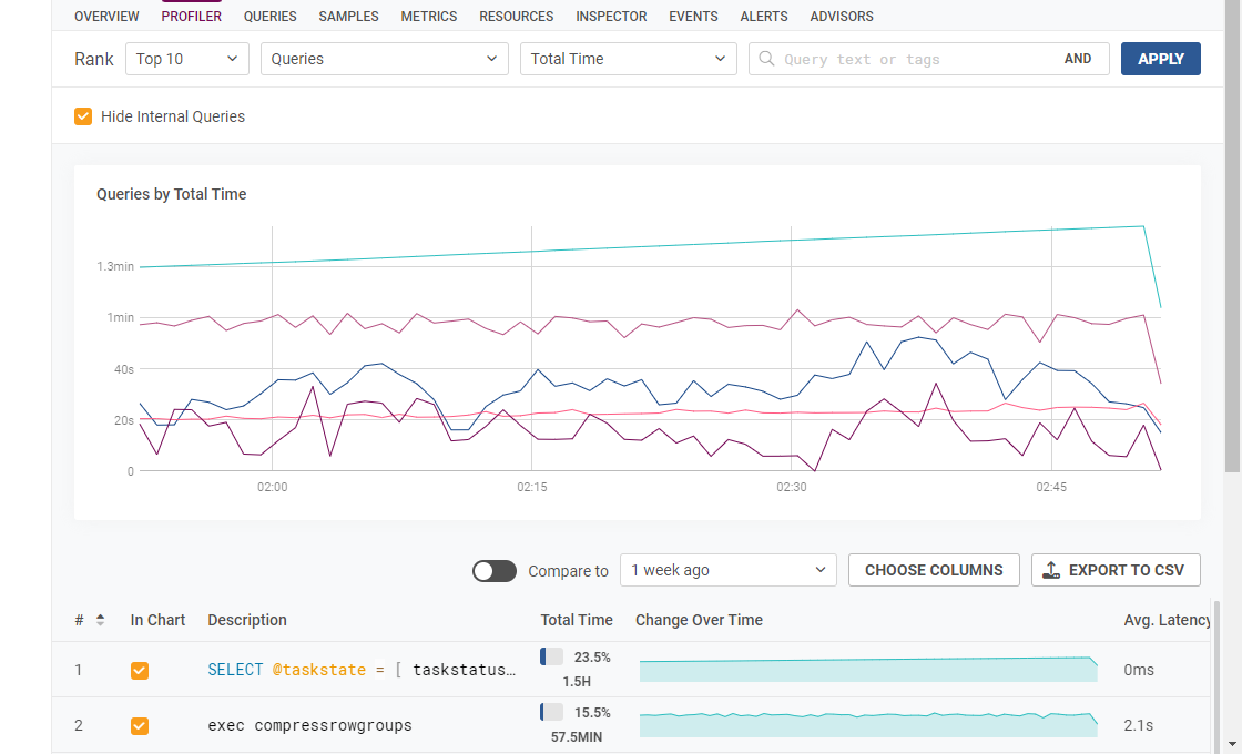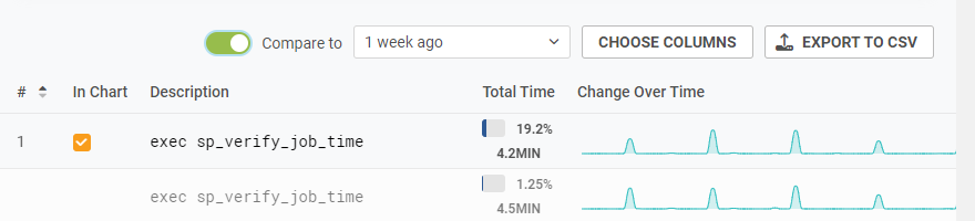 For example, if you are profiling the top 10 queries by total time for the last day, clicking Compare to with the default selection of 1 week ago will also display the top 10 queries by total time for the previous 7 days, allowing you to easily compare the data, and any changes over time. The numbered query represents the query from the currently selected time range, and the query beneath the numbered query represents the query 7 days before the selected time range.