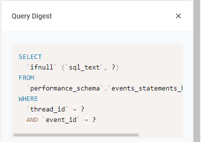 Click the query text to open the Query Digest. The Query Digest displays the full query text in an easy to read format. Click Copy To Clipboard to copy the query text.