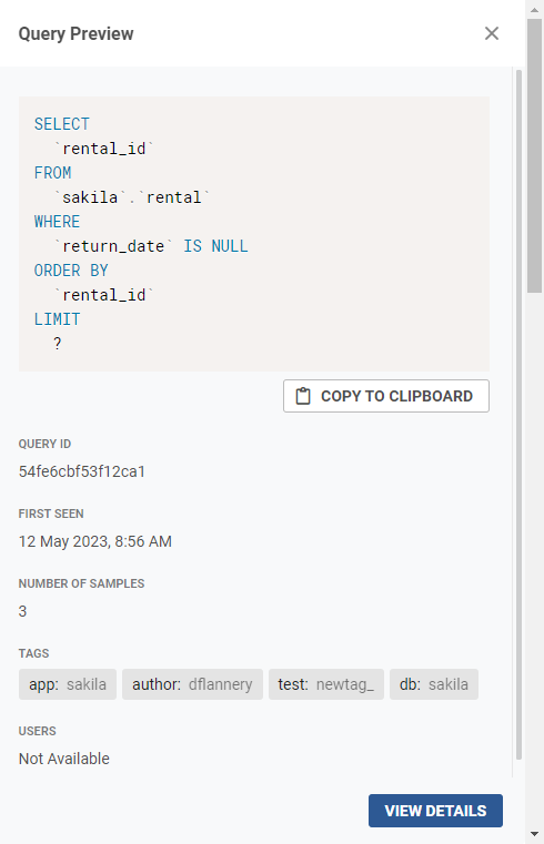 Click the desired query to open the Query Preview panel. The Query Preview displays the full query text with syntax highlighting for the selected query, and details about the query including the Query ID, First Seen date, and Database Host(s) where the query was observed. The Query Panel will also display any failed Advisors related to the query. See Advisors for more information about Query Advisors.