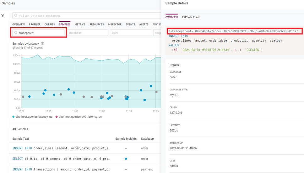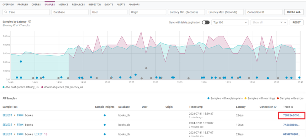 After integration, the Samples tab shows links between traced requests and the query samples captured by DBO, showing the context in which each query was executed.