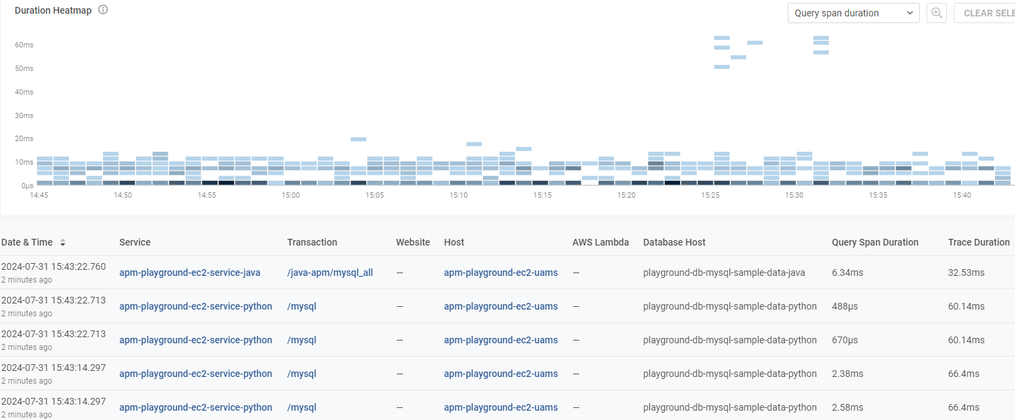 If APM is correctly configured, you should see trace context injected as a comment in sample details on the DBO side. You can filter queries by the keyword traceparent to see only query samples with trace context injected.