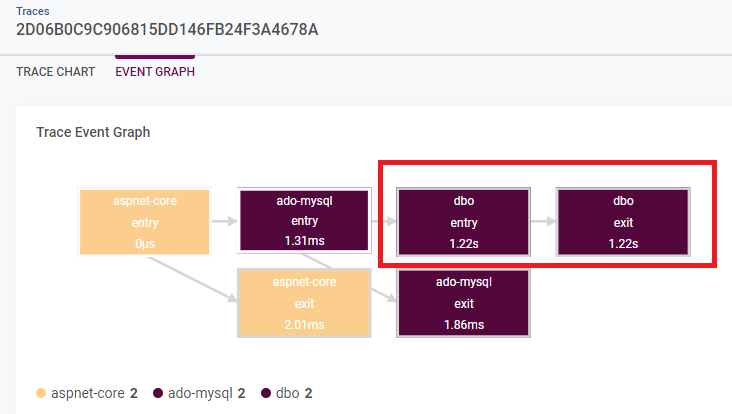To verify that the DBO Agent publishes server side spans for an operation, navigate from the query sample to the trace details view. Search for DBO events on the event graph view. If an event is available, it means that the DBO Agent correctly published the span that represents the server side of a query execution.