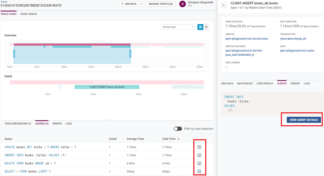 You can drill down from queries traced by the APM module to performance details in the DBO module. You can navigate either to the query in DBO, or to the exact query sample if it is available for the selected trace.