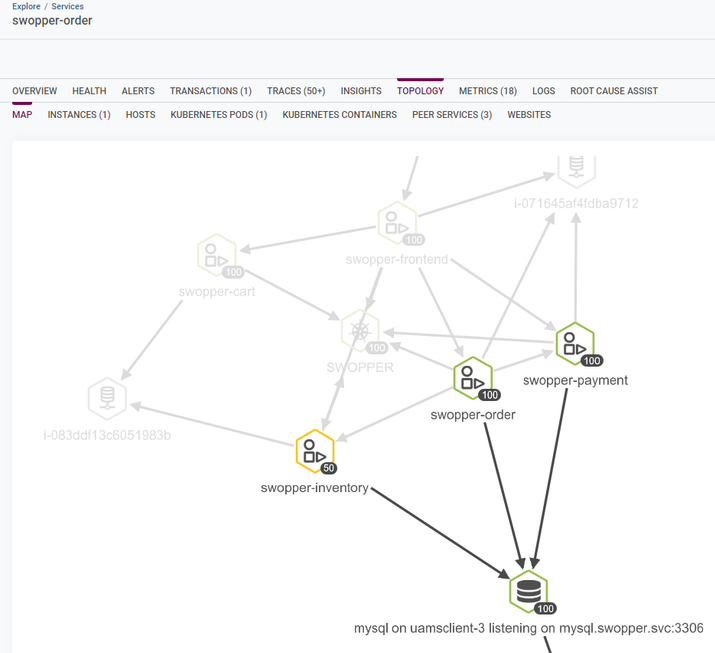 After integration, the entities model is aware of the relation between a service and a database instance.
