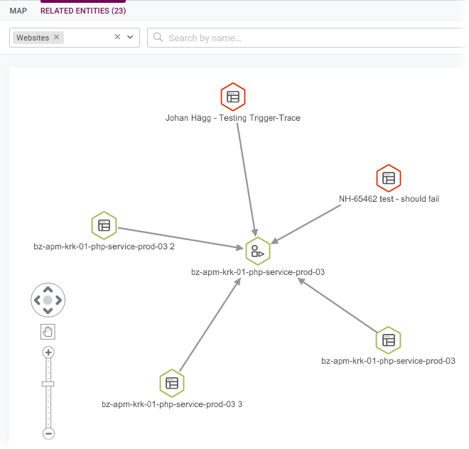 to display the entities as a topology map. Click an entity in the map to open the details pane. Use the Zoom buttons in the lower-right corner to zoom in or out, and click the Center button