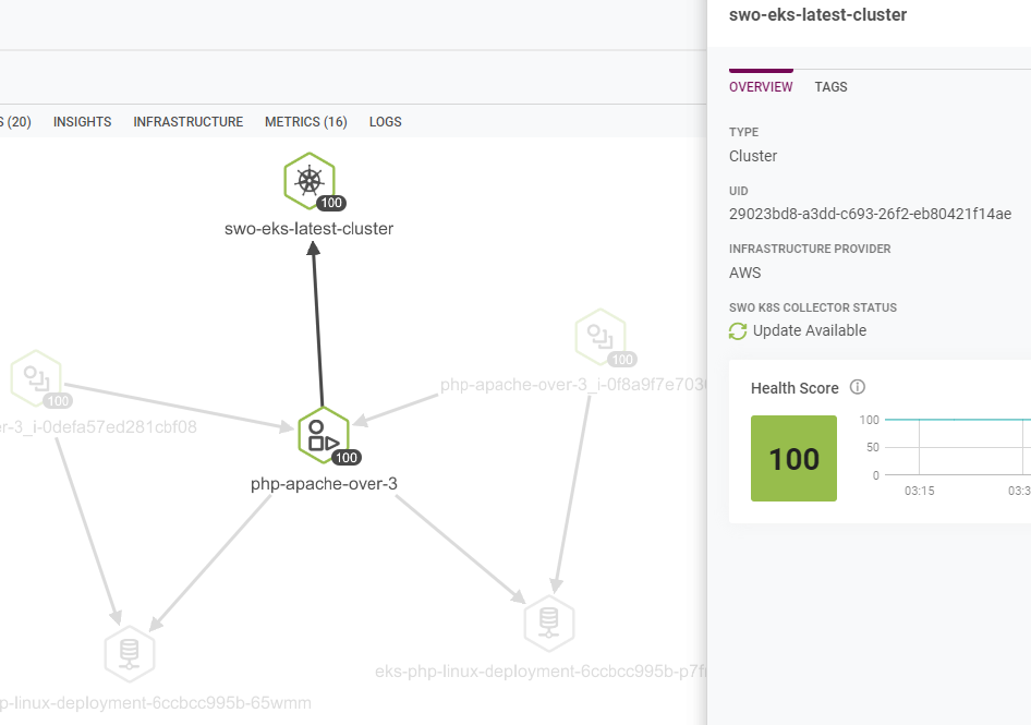 If a service is performing poorly, use the Topology tab to examine the health and performance of related entities. The amount of information available depends on whether the related entity is also monitored by SolarWinds Observability SaaS.