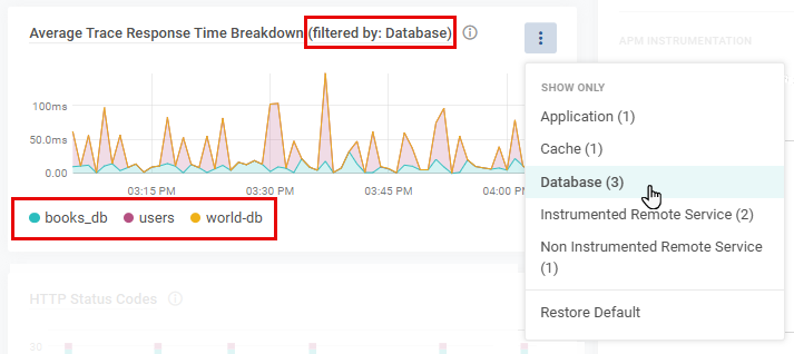 Use the three-dot menu to filter by operation type and show details of that type in the breakdown. For example, selecting databases will show average response time per database name.