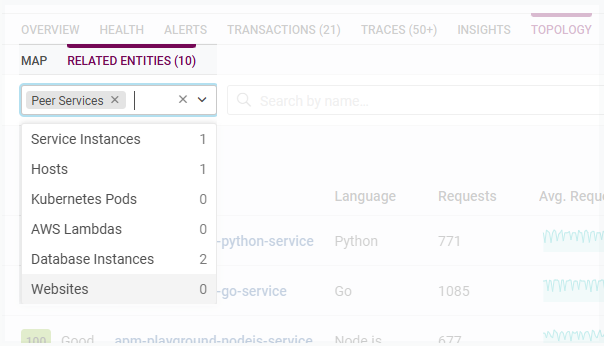 All related entities and their counts are available at a glance, including service and database instances, hosts, Kubernetes Pods, AWS Lambdas, peer services, and websites associated with the service, reducing time spent switching between different tabs.