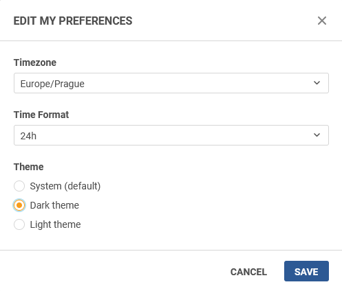 Provides the option to set up the preferred timezone, time format, and theme (dark or light).