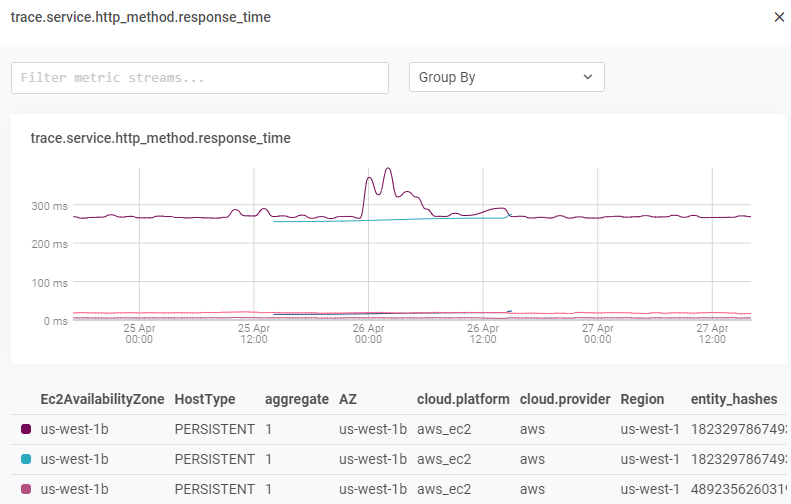 Position your mouse pointer over the chart to see the metric values for each measurement stream at a specific point in time.
