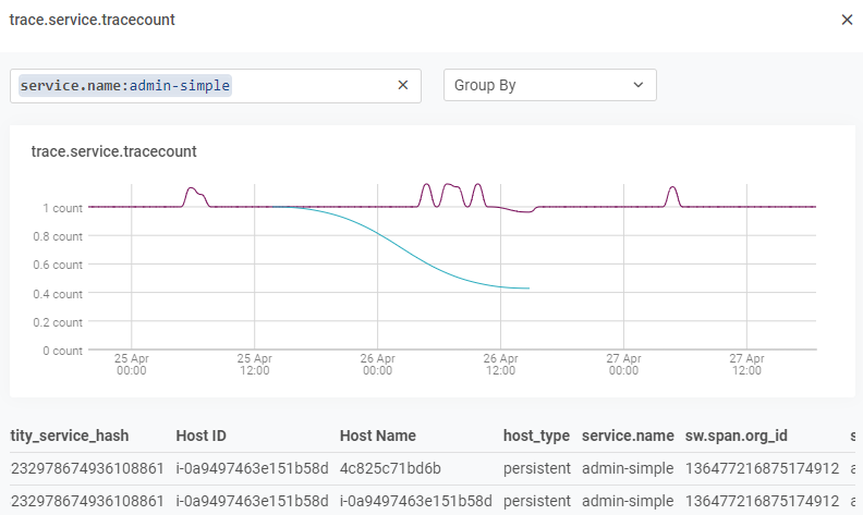 When you group measurement streams, each line in the chart represents a set of data with the same values for the selected tags. Values for other tags might be different. The table columns include only the tags used for grouping. In the following example, each line represents data that came from services that have the same name and ran on the same host.