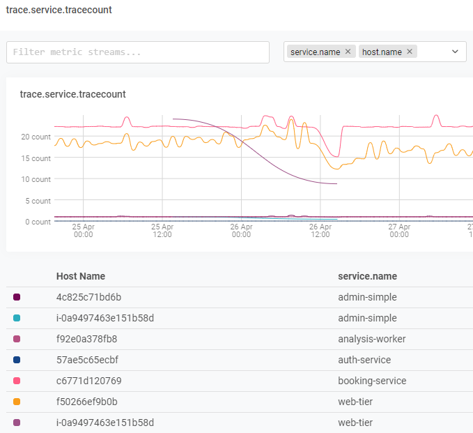 Each line on the chart and each row in the table represents a measurement stream. A measurement stream is a set of data that came in with the same combination of tag values. For example, a metric has tags indicating the name of a service and the host on which it ran. Data tagged with Service1 and Host1 would be in one measurement stream, while data tagged with Service1 and Host2 would be in a different measurement stream.