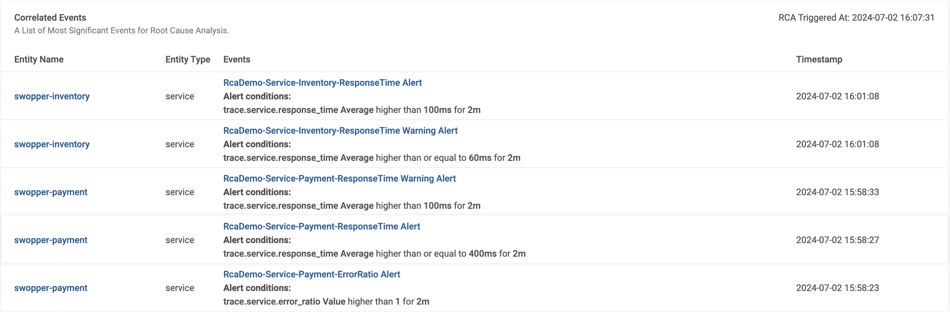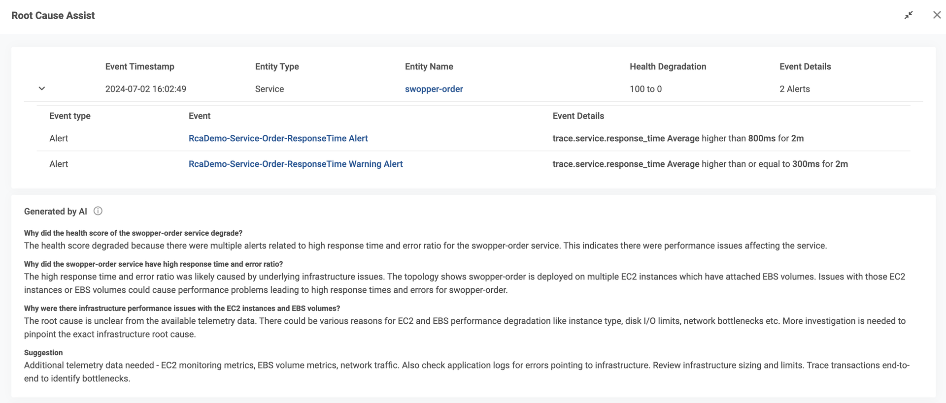 To see data that can help you investigate a specific degradation event, you can trigger an RCA. When you trigger an RCA, Root Cause Assist uses its correlation engine powered by SolarWinds AI to identify causal relationships between the collected events across all entities (source entities and related entities) and give you a detailed analysis with context and starting points for further investigation or resolution.