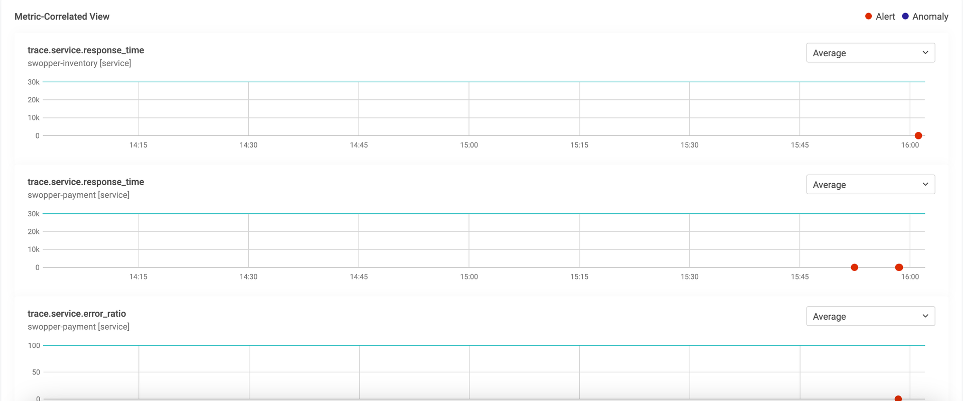 The Metric-Correlated View overlays where any correlated events (alerts, anomalies, database events, Kubernetes events) occurred on the chart highlighting the time-series metric data.