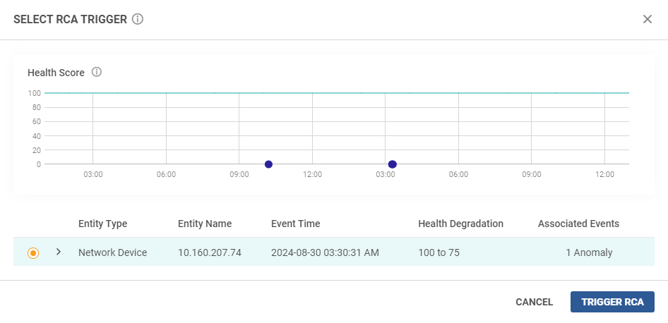 Click the desired health degradation event within the last 24 hour period that you want to analyze. Click Trigger RCA.   A RCA Triggered Successfully prompt is displayed. Note that it can take up to one minute to see the details of the Root Cause Assist.