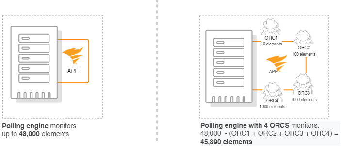 One polling engine for every ~12,000 elements. See How is SolarWinds NPM licensed? Starting with Orion Platform 2020.2, a maximum of 100 APEs per instance with up to 1,000,000 elements monitored per instance. |