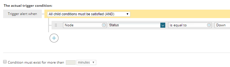 Select and enter a value for Condition must exist for more than to prevent being alerted when a node enters the down state frequently within a set amount of time. This prevents you from receiving alerts until the node has been in the down state for longer than the time you have selected.