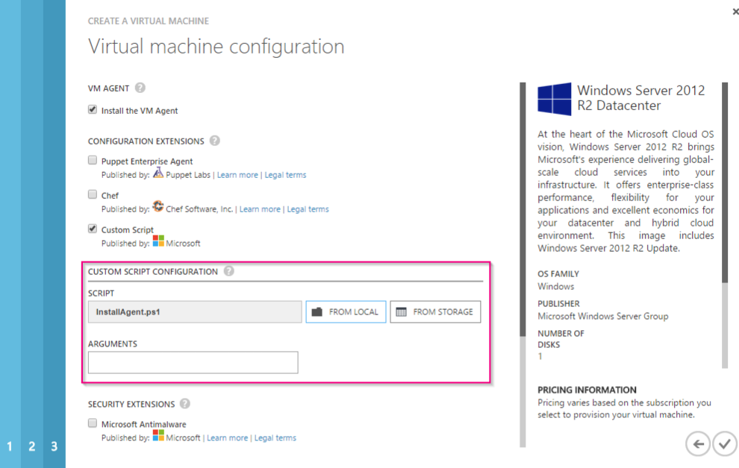 - In the Microsoft Azure portal, use the Create a Virtual Machine wizard to add the PowerShell script to each VM on the Virtual machine configuration page.