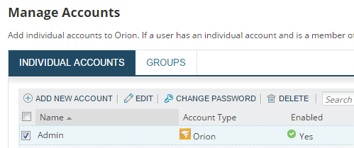 The following steps change passwords for Orion individual accounts. If you are using Windows accounts (Active Directory or local domain accounts) or SAML accounts to log in to the SolarWinds Platform Web Console, you need to contact your system administrator or identity provider to change your user password.