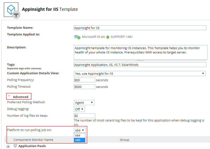 Using AppInsight applications with 32-bit polling on 64-bit computers via an agent may prevent certain performance counters from collecting information and should be changed to 64-bit polling.