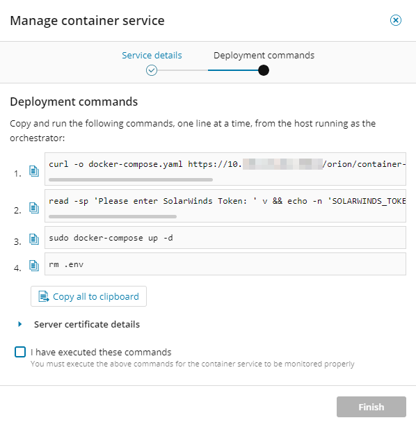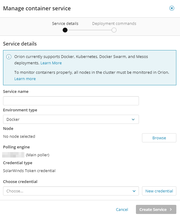 After reviewing Container monitoring requirements, you can use the Manage container services wizard to connect to Linux environments so you can monitor containers within the SolarWinds Platform Web Console. Based on the selected service type (for example, Docker), the wizard generates commands that you can copy and run on Linux hosts that deploy elements such as Orion Monitor containers and Orion Aggregator containers.