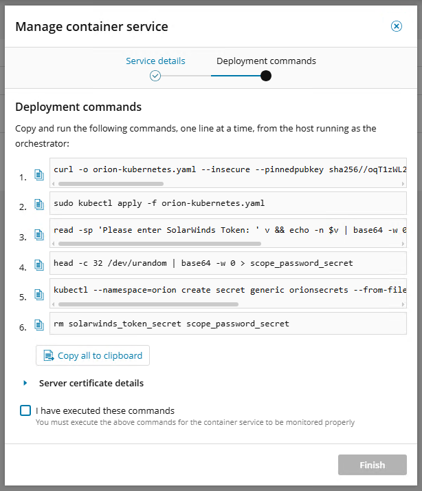 After all commands have been executed, select the checkbox to confirm, then click Finish.