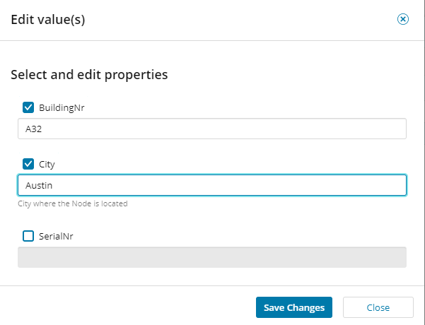 To add the same value for multiple objects, select the objects, and click Edit Value(s). Select the property, enter the value, and click Save Changes.