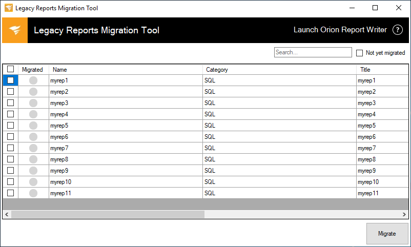 To migrate all legacy reports that have not been migrated yet, select the Not yet migrated box and click the box in the table header to select all displayed items.