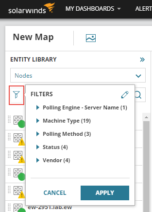 Under the Entity Library drop-down, click the filter button. This opens a panel containing available options for filtering entities on, such as Polling Engine - Server Nam, Machine Type, Polling Method, Status, and Vendor.