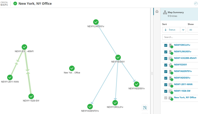 You can view Intelligent Maps for a group, just as you can for an interface, volume, node, or any other object monitored in SolarWinds Platform products. However, Intelligent Maps for groups are slightly different because they do not show all related entities.