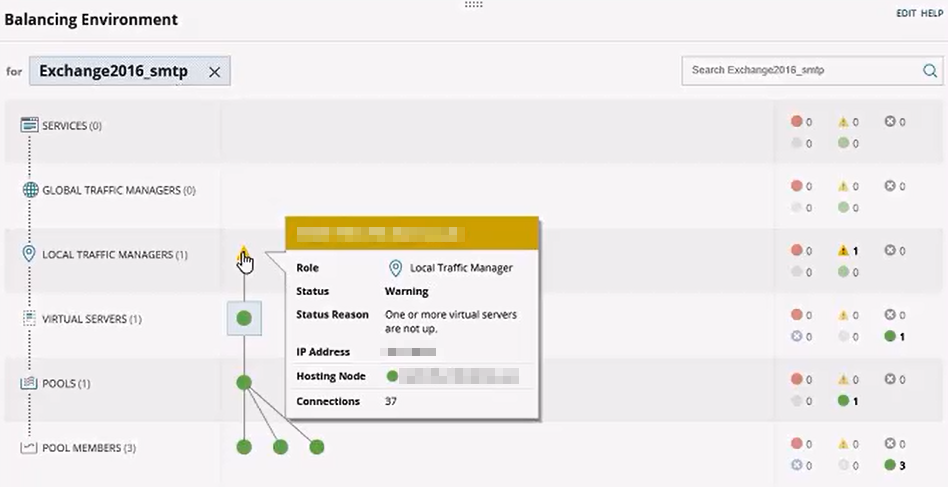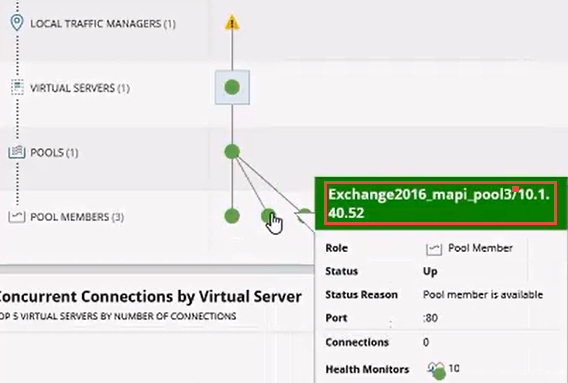 - View the health of the load balancer that splits traffic for your Exchange servers, and view relationships to virtual servers, pools, and individual pool members.