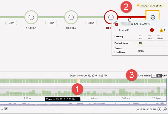 To see details about an issue in the history, find the time of the issue in the Path History (1), and click a problematic time slot. Review the path from the past and locate the issue (2). To return to the current time, click Live Mode (3).
