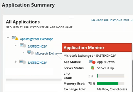 SolarWinds SAM is a crucial component in comprehensive Exchange monitoring. SAM monitors your Exchange servers and IIS applications. During discovery, Orion identifies each server and automatically applies either an AppInsight for Exchange template or an AppInsight for IIS template. The AppInsight templates provide metrics about Exchange services including data about performance, mailboxes, sites, users and access, hardware health, and more.