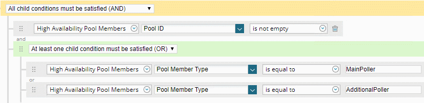 - Trigger the alert when your HAPool Members' Pool ID is not empty. You must also specify a Pool Member Type. For example, the following conditions monitor both your main pool and your additional polling engines.
