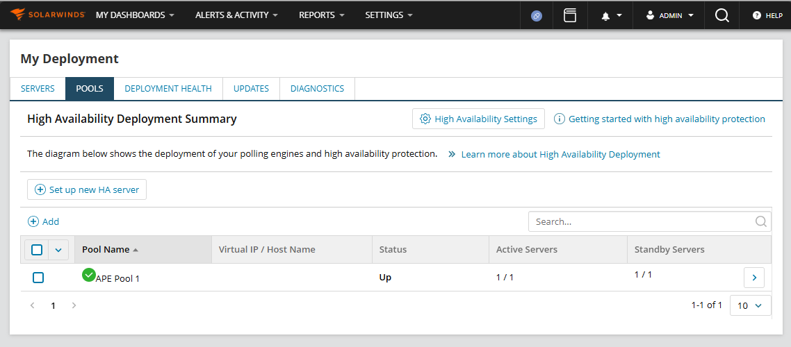 Set up HA pools with multiple active and standby servers for your Additional polling engines. See also Set up a SolarWinds Platform High Availability pool. You can also use the SolarWinds Platform API to set up HA multi-clustering.